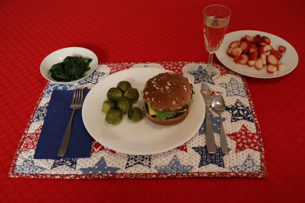 On Sunday, I’d cooked the spinach and Brussels sprouts in time and served them with a vegan burger for a great, healthy meal.